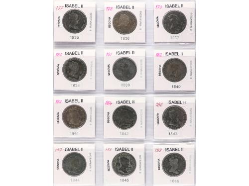 ISABEL II. Lote 12 monedas 2 Maravedís. 1838 a 1850. JUBIA (3) y SEGOVIA (9). Todas diferentes. A EXAMINAR. BC a MBC-.