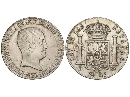 FERNANDO VII. 20 Reales. 1823. BARCELONA. S.P. 26,75 grs. Tipo Cabezón. Acuñación algo floja, normal en esta pieza. RARA. AC-1146. MBC-/MBC.