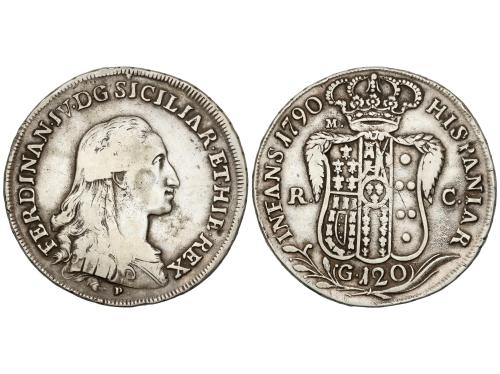 INFANTES DE ESPAÑA. Piastra (120 Grana). 1790. FERNANDO de DOS SICILIAS. NÁPOLES. P.M./R-C. 26,88 grs. AR. MIR-370/10; Tauler-3926; Vti-291. MBC-.