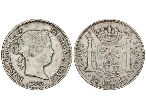 ISABEL II. 20 Reales. 1863/53. SEVILLA. 25,65 grs. (Rayitas). ESCASA. AC-642. MBC.