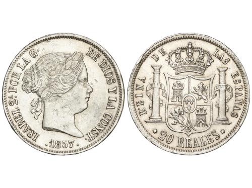 ISABEL II. 20 Reales. 1857. SEVILLA. 25,77 grs. (Rayitas). AC-634. MBC+.
