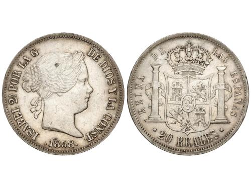 ISABEL II. 20 Reales. 1858. SEVILLA. 25,77 grs. (Descolgada). AC-635. MBC.