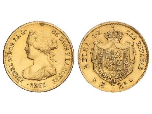 ISABEL II. 2 Escudos. 1865. MADRID. 1,67 grs. AU. (Rayitas en anverso, limpiada). AC-675. MBC.
