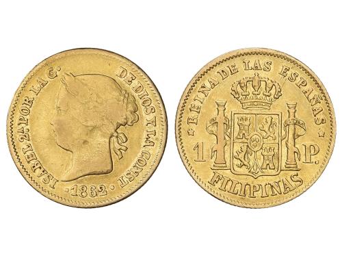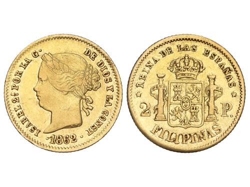 ISABEL II. 1 Peso. 1862. MANILA. 1,66 grs. AU. (Rayitas y golpecito de punzón en anverso). AC-821. MBC-/MBC.