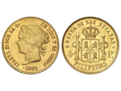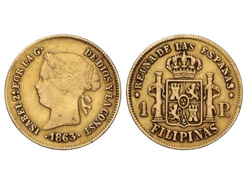 ISABEL II. 1 Peso. 1863. MANILA. 1,66 grs. AU. (Leves rayitas). AC-823. MBC.