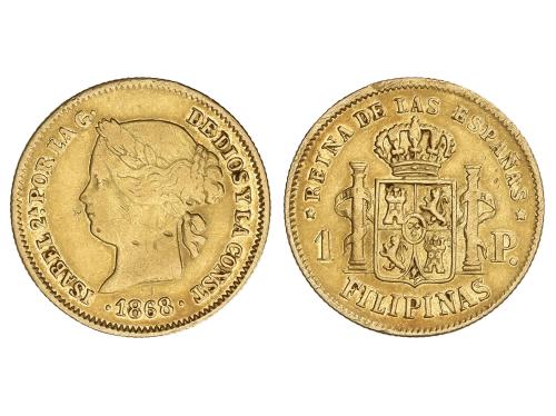 ISABEL II. 1 Peso. 1868. MANILA. 1,64 grs. AU. (Rayitas y golpecitos). AC-833. MBC-.