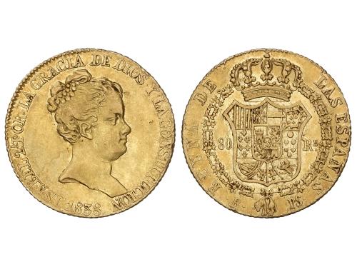 ISABEL II. 80 Reales. 1838. BARCELONA. P.S. 6,73 grs. Final leyenda anverso: CONSTITUCIÓN. (Rayitas en anverso). AC-701. MBC+.