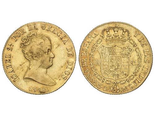 ISABEL II. 80 Reales. 1836. SEVILLA. D.R. 6,70 grs. (Hojitas en anverso, probablemente ha estado en aro). AC-738. MBC.