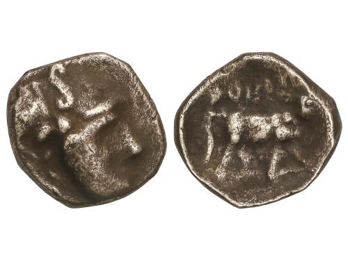 MONEDAS HISPÁNICAS. Dracma. 300-200 a.C. ARSE (SAGUNTO, Valencia). Anv.: Cabeza galeada a derecha. Rev.: Toro androcéfalo a derecha, encima leyenda ibérica ARSEETaR. 3,21 grs. AR. Pátina. RARA. AB-2038; ACIP-1934. MBC-.