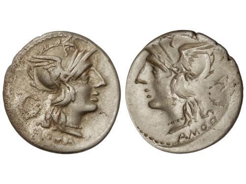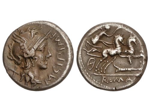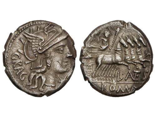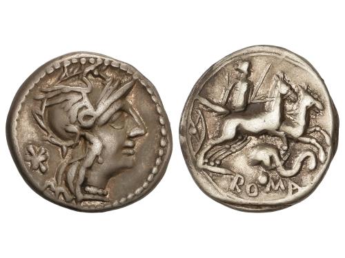 REPÚBLICA ROMANA. Denario. 136 a.C. ANTESTIA. L. Antestius Gragulus. Anv.: Cabeza de Roma a derecha, delante estrella, detrás GRAG. Rev.: Júpiter en cuadriga a derecha, debajo L. ANTES (ANTE entrelazadas). En exergo: ROMA. 4,02 grs. AR. (Leves oxidaciones). BMC-976; Craw-238/1; Cal-127; FFC-151; Se-9. MBC+.