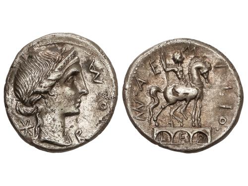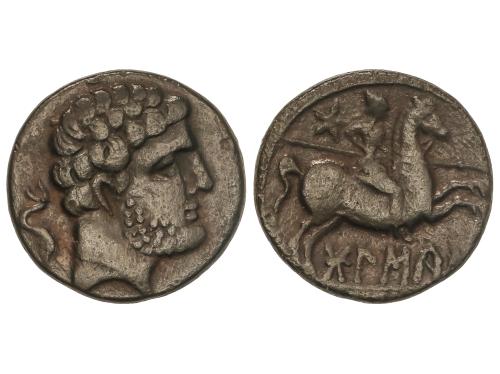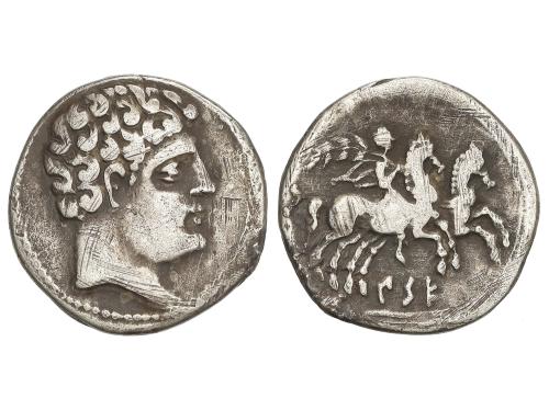 MONEDAS HISPÁNICAS. Denario. 120-20 a.C. CESE (TARRAGONA). Anv.: Cabeza imberbe a derecha. Rev.: Jinete con palma a derecha conduciendo un segundo caballo, debajo leyenda ibérica CeSE sobre linea. 3,74 grs. AR. (Rayas). Pátina. ESCASA. AB-2266; Vill-17. MBC-.