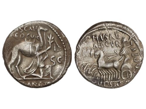 REPÚBLICA ROMANA. Denario. 58 a.C. AEMILIA. M. Aemilius Scaurus y Pub. Plautius Hypsaeus. Anv.: M. SCAVR. AED. CVR., a los lados (EX) SC. En exergo: (REX) ARETAS. Rey Aretas de rodillas a derecha, detrás camello. Rev.: P. HVPSAE AED. CVR. En exergo: C. HVPSAE. (COS. PREIVE). Júpiter en cuadriga a izquierda escorpión bajo los caballos. 3,63 grs. AR. BMC-3878; Cal-89; Craw-422.1b; FFC-123; Se-8. MBC+.