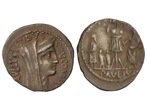 REPÚBLICA ROMANA. Denario. 62 a.C. AEMILIA. Paullus Aemilius Lepidus. Anv.: PAVLLS LEPIDUS CONCORDIA. Cabeza velada y diademada de Concordia a derecha. Rev.: L. Aemilius y Perseo de Macedonia con sus dos hijos en medio trofeo, encima: (TER). En exergo: PAVLLVS. 3,68 grs. AR. Pátina. BMC-3376; Craw-415/1v; FFC-127. MBC.