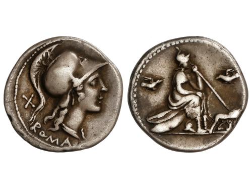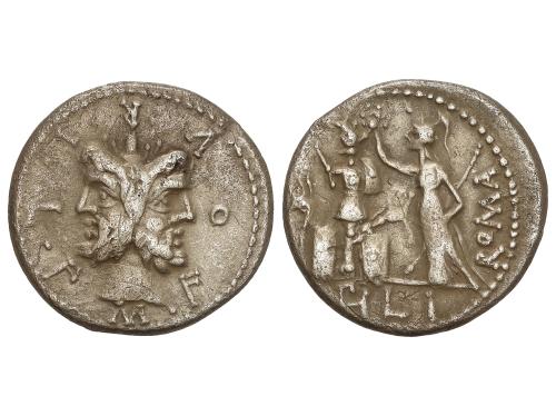 REPÚBLICA ROMANA. Denario. 119 a.C. FURIA. M. Furius L.f. Philus. Anv.: Cabeza de Jano bifronte M. FOVRI.L.F. Rev.: Roma en pie coronando un trofeo a derecha ROMA. En exergo: PHILI. 3,75 grs. AR. BMC-555; Cal-600; Craw-281/1; FFC-730; Se-18. MBC.