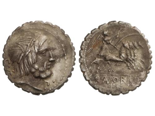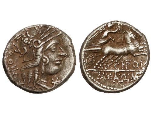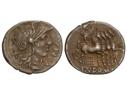 REPÚBLICA ROMANA. Denario. 116-115 a.C. DOMITIA. Cnaeus Domitius Ahenobarbus. Anv.: Cabeza de Roma entre X y ROMA. Rev.: Júpiter en cuadriga a derecha, debajo CN.DOMI. 3,88 grs. AR. Pátina. BMC-490; Cal-544; Craw-285-1; FFC-681; Se-7. MBC.