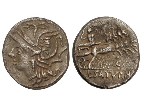 REPÚBLICA ROMANA. Denario. 104 a.C. APPULEIA. Lucius Appuleius Saturninus. Anv.: Cabeza de Roma a izquierda. Rev.: Saturno en cuadriga a derecha, debajo letra C. En exergo: L. SATVRN. 3,69 grs. AR. Ligera pátina. BMC-1523-57; Cal-225; Craw-317/3b; FFC-161; Se-1. MBC+/MBC.