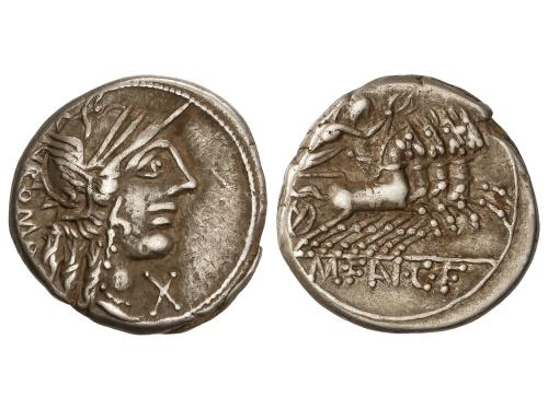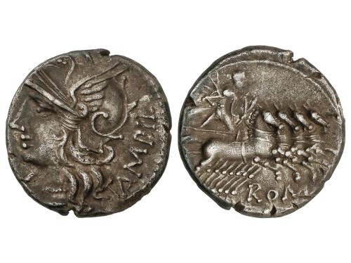 REPÚBLICA ROMANA. Denario. 123 a.C. FANNIA. Marcius Fannius C.f. Anv.: Cabeza de Roma a derecha, entre ROMA y X. Rev.: Victoria en cuadriga a derecha, en exergo M.FAN, C.F. 3,94 grs. AR. BMC-468; Cal-576; Craw275-1; FFC-705; Se-1. MBC.