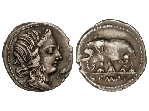 REPÚBLICA ROMANA. Denario. 81 a.C. CAECILIA. Caecilius Metellus Pius. HISPANIA. Anv.: Cabeza diademada de la Piedad a derecha, delante cigüeña. Rev.: Elefante a izquierda. En exergo: Q.C.M.P.I. 3,66 grs. AR. Pátina. BMC-43; Cal-289; Craw-374/1; FFC-213; Se-43. MBC+/MBC.