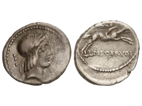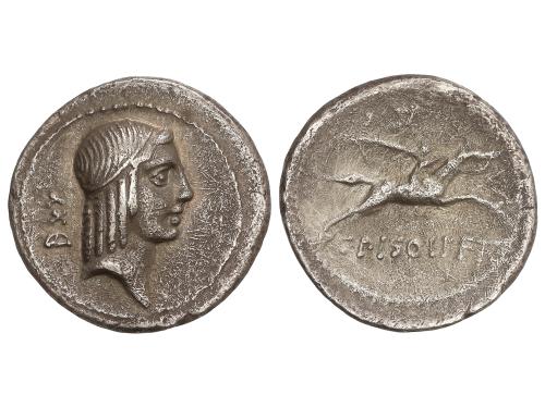 REPÚBLICA ROMANA. Denario. 64 a.C. CALPURNIA. C. Calpurnius Piso Frugi. Anv.: Cabeza laureada de Apolo a derecha, detrás número DXX. Rev.: Jinete galopando a derecha, encima símbolo no visible, debajo C. PISO L.F. FRV. 3,15 grs. AR. (Oxidaciones). Cal-342o; FFC-418 sim. MBC+/MBC-.