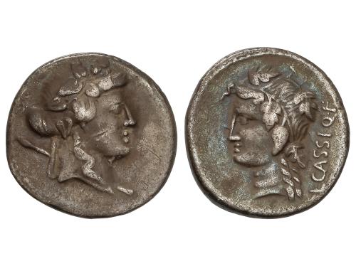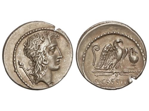 REPÚBLICA ROMANA. Denario. 55 a.C. CASSIA. Q. Cassius Longinus. Anv.: Cabeza de Bonus Eventus a derecha, detrás cetro. Rev.: Águila a derecha, entre lituo y praeferículo, debajo Q. CASSIVS. 3,77 grs. AR. (Golpe cizalla en canto). Restos de brillo original. BMC-3868; Cal-411; Craw-428/3; FFC-557. EBC-.