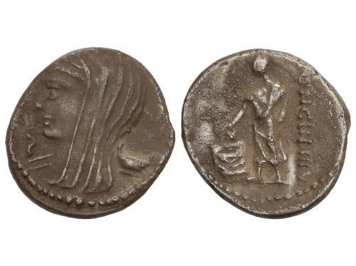 REPÚBLICA ROMANA. Denario. 55 a.C. CASSIA. L. Cassius Longinus. Anv.: Busto velado de Vesta a izquierda entre letra y copa. Rev.: Ciudadano romano votando, detrás LONGIN IIIV. 3,85 grs. AR. (Oxidaciones). Pátina. BMC-3929-36; Cal-415; Craw-413/1; FFC-561; Se-10. MBC.