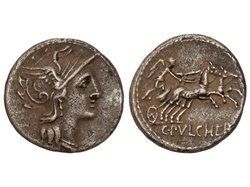 REPÚBLICA ROMANA. Denario. 117-111 a.C. FULVIA. Cn. Fulvius, M. Calidius y Q. Metellus. Anv.: Cabeza de Roma a derecha, detrás ROMA. Rev.: Victoria en biga a derecha. Debajo CN.FOUL, en exergo M. CAL.Q.MET. 3,95 grs. AR. Pátina. BMC-476; Cal-596; Craw-284-1; FFC-726; Se-1. MBC.