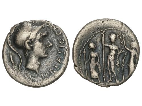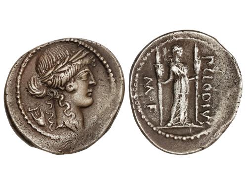 REPÚBLICA ROMANA. Denario. 42 a.C. CLAUDIA. P. Claudius M. f. Turrinus. Anv.: Cabeza laureada de Apolo a derecha, detrás lira. Rev.: Diana Lucifera de pie con dos largas antorchas. P. CLODIVS M.F. 3,03 grs. AR. (Oxidaciones). Pátina. BMC-4290; Cal-428; Craw-494/23; FFC-569; Se-15. MBC+.