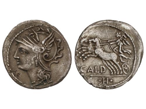 REPÚBLICA ROMANA. Denario. 104 a.C. COELIA o COILIA. C. Coelius Caldus. Anv.: Cabeza de Roma a izquierda. Rev.: Victoria en biga a izquierda, debajo CALD, En exergo: letra H. 3,56 grs. AR. (Oxidaciones). Pátina. BMC-1463-92; Cal-442; Craw-318/1b; FFC-575; Se-3. MBC.
