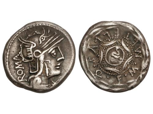 REPÚBLICA ROMANA. Denario. 127 a.C. CAECILIA. M. Caecilius Metellus Q. f. Anv.: Cabeza de Roma a derecha, estrella en la parte inferior trasera del casco entre ROMA y asterisco. Rev.: Escudo macedonio. M.METELLVS. 3,87 grs. AR. Pátina. BMC-1145; Cal-281; Craw-263/1a; FFC-205; Se-29. MBC+.