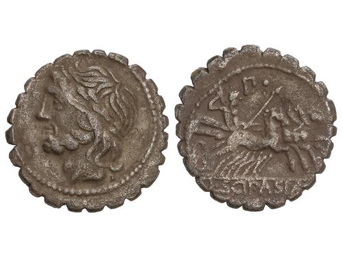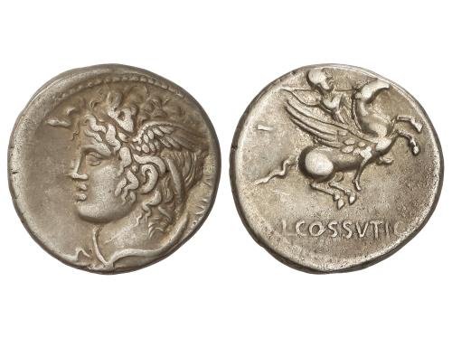 REPÚBLICA ROMANA. Denario. 74 a.C. COSSUTIA. L. Cossutius C.f Sabula. Anv.: Cabeza alada de Medusa a izquierda, detrás (SA)BVLA. Rev.: Ballerophon montando Pegaso a derecha, a izquierda número X, debajo L. COSSVTI. (C.F.). 3,91 grs. AR. ESCASA. BMC-3320-28; Cal-515; Craw-395/1; FFC-655; Se-1. MBC+.