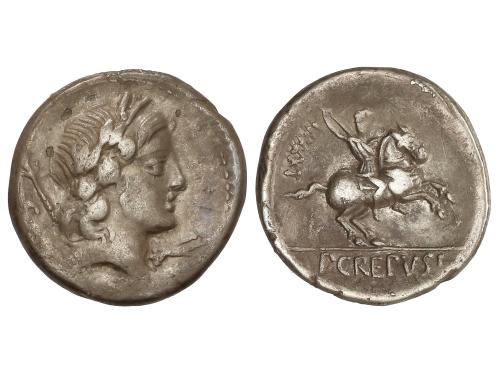 REPÚBLICA ROMANA. Denario. 82 a.C. CREPUSIA. Publius Crepusius. Anv.: Cabeza laureada de Apolo a derecha, delante símbolo, detrás cetro. Rev.: Jinete con lanza a derecha, detrás número. En exergo: P. CREPVSI. 3,60 grs. AR. BMC-2664-8; Cal-525; FFC-660; Se-1b. MBC.