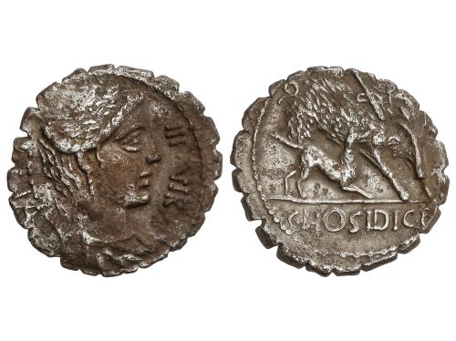 REPÚBLICA ROMANA. Denario. 68 a.C. HOSIDIA. C. Hosidius C.f. Geta. Anv.: Busto sin diadema de Diana a derecha con arco y carcaj. Leyendas invertidas III VIR-GETA. Rev.: Jabalí a derecha atravesado por una flecha y atacado por un perro. En exergo: C. HOSIDI. C.F. 3,48 grs. AR. (Oxidaciones). Pátina. BMC-3386; Cal-620; Craw-407/1; FFC-752; Se-2. MBC.