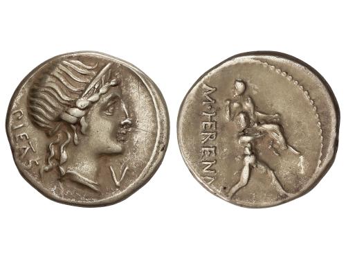 REPÚBLICA ROMANA. Denario. 108-107 a.C. HERENNIA. Marcus Herennius. Anv.: Cabeza de la Piedad a derecha, detrás PIETAS, delante V. Rev.: Amphinomus con su padre sobre los hombros, a izquierda M. HERENNI. 3,90 grs. AR. BMC-1231-57; Cal-615; Craw-308/1a; FFC-743; Se-1. MBC+/MBC.