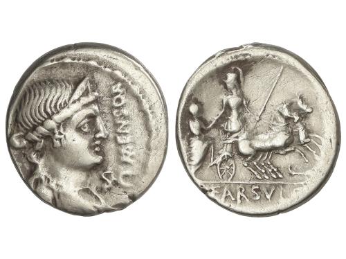 REPÚBLICA ROMANA. Denario. 75 a.C. FARSULEIA. L. Farsuleius Mensor. Anv.: Busto diademado de la libertad a derecha, delante: MENSOR, bajo el mentón: S.C. Rev.: Guerrero con lanza en biga a derecha y personaje montando en el carro, debajo los caballos escorpión. En exergo: L. FARSVLEI. 3,82 grs. AR. (Limpiada). BMC-3293-05; Cal-577; Craw-392/1b; FFC-706; Se-2. MBC.