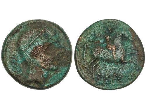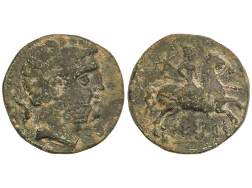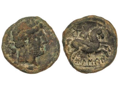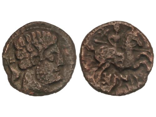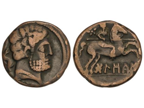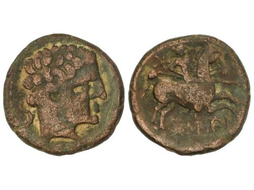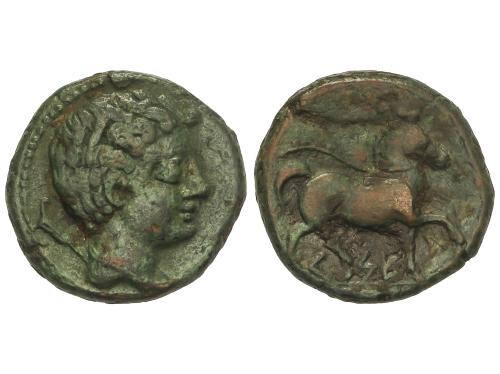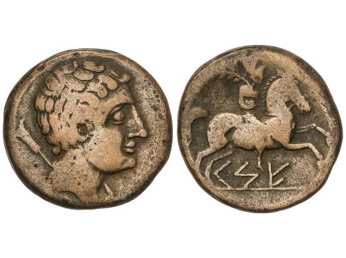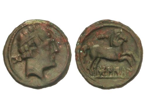 MONEDAS HISPÁNICAS. Semis. 120-20 a.C. CESE (TARRAGONA). Anv.: Cabeza masculina a derecha, detrás timón. Rev.: Caballo al trote a derecha. 5,36 grs. Pátina. AB-2310. MBC.