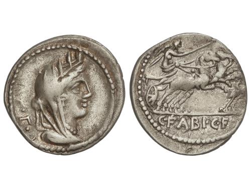REPÚBLICA ROMANA. Denario. 104 a.C. FABIA. C. Fabius C.f. Hadrianus. Anv.: Cabeza de Cibeles a derecha, detrás letra griega. Rev.: Victoria en biga a derecha, debajo cigüeña. En exergo: C. FABI. C.F. 3,85 grs. AR. (Leves golpecitos). Cal-574; FFC-702; Se-15; S.Domingo-252. MBC+/MBC.