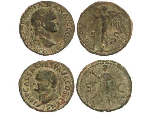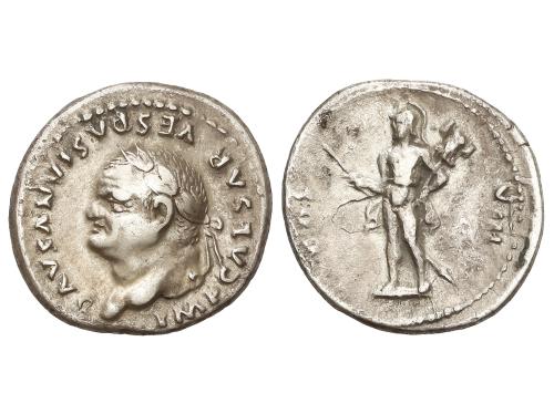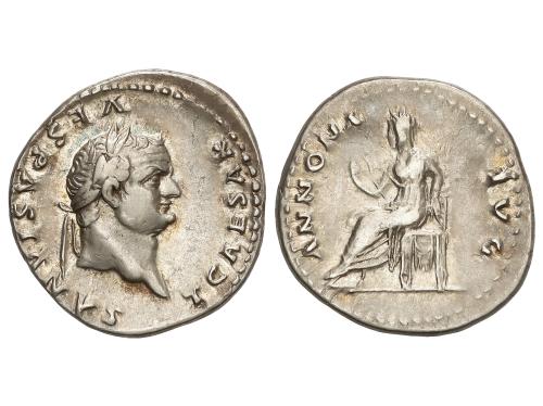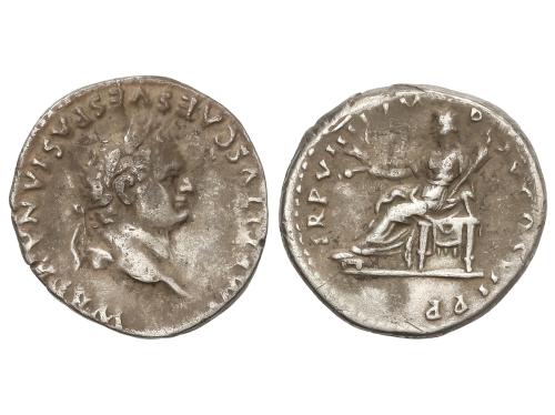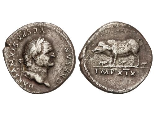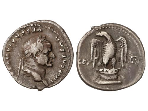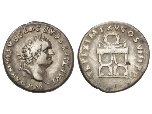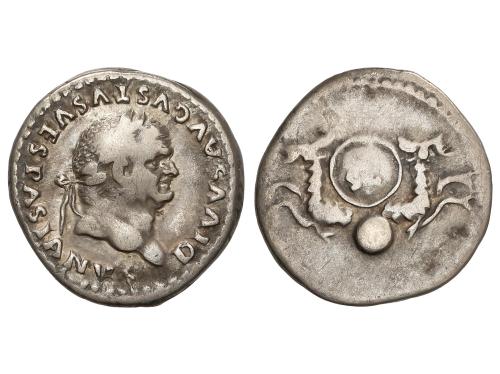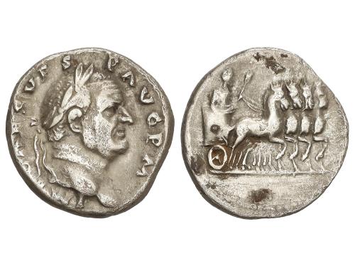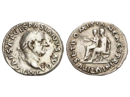 IMPERIO ROMANO. Denario. 69 d.C. VESPASIANO. Anv.: IMP. CAESAR VESPASIANVS AVG. Cabeza laureada a derecha. Rev.: TITVS ET DOMITIAN. CAES. PRIN. IV. Tito y Domiciano sentados en sillas curules a izquierda, con ramas. 3,14 grs. (Pequeñas oxidaciones en anverso). C-541; RIC-23. MBC.