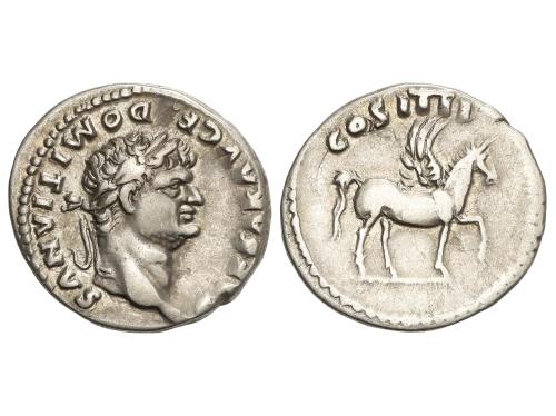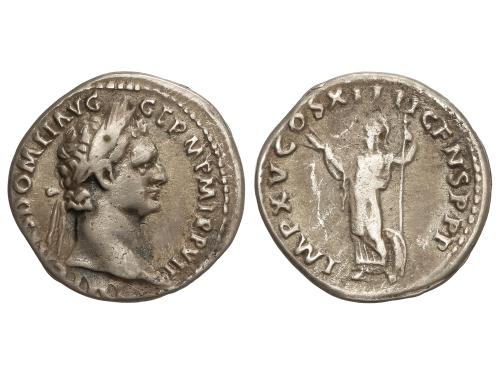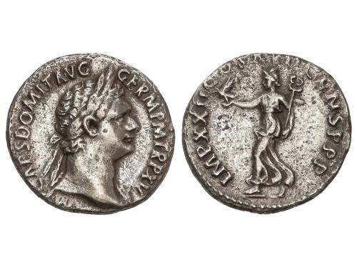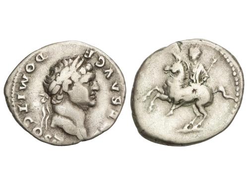 IMPERIO ROMANO. Denario. 96 d.C. DOMICIANO. Anv.: IMP. CAES. DOMIT. AVG GERM. P. M. TR. P. XV. Cabeza laureada a derecha . Rev.: IMP. XXII COS. XVII CENS. P. P. P. Maia avanzando a izquierda con una paloma y un caduceo. 2,90 grs. (Oxidaciones). C-295; RIC-786. MBC.