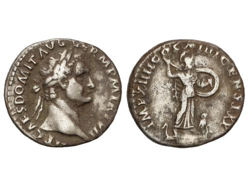 IMPERIO ROMANO. Denario. 88 d.C. DOMICIANO. Anv.: IMP. CAES. DOMIT. AVG GERM. P. M. TR. P. VII. Cabeza laureada a derecha . Rev.: IMP. XIIII COS. XIIII CENS. P. P. P. Minerva a derecha blandiendo lanza sobre proa, a los pies buho. 3,18 grs. Pátina. BMC-122; C-233; RIC-110. MBC.