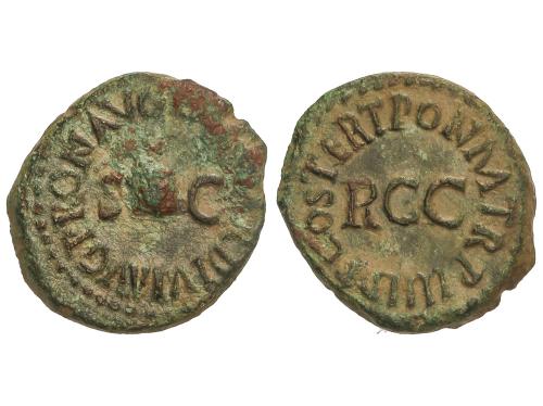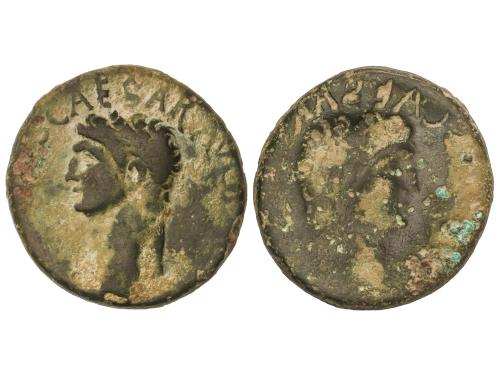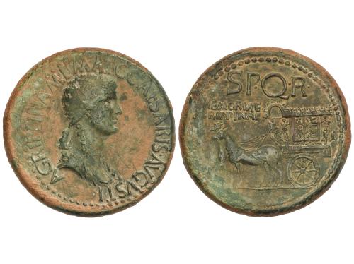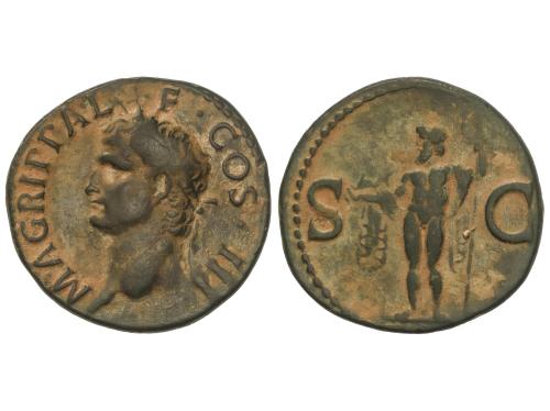IMPERIO ROMANO. As. 23-32 d.C. AGRIPA. Anv.: M. AGRIPPA L. F. COS. III. Cabeza a izquierda con corona. Rev.: S. C. Neptuno en pie a izquierda con tridente y delfín; manto sobre los hombros. 10,84 grs. Pátina. ESCASA. C-3; RIC-58 (Calígula); BMC-161 (Tiberio). MBC.
