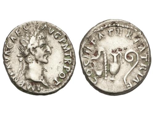 IMPERIO ROMANO. Denario. 97 d.C. NERVA. Anv.: IMP. NERVA CAES. AVG. P. M. TR. POT. Cabeza laureada a derecha. Rev.: COS. III. PATER PATRIAE. Símpulo, aspersorio, vaso de sacrificio y bastón de augur. 3,10 grs. (Oxidaciones limpiadas). C-48; RIC-24; BMC-33. MBC.