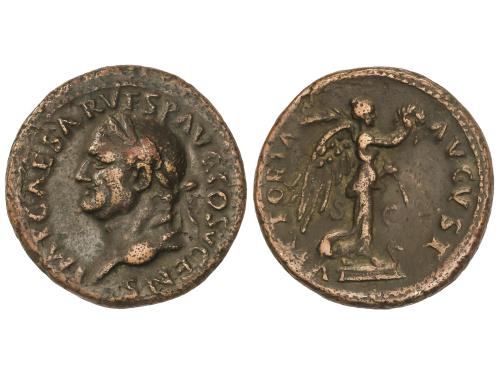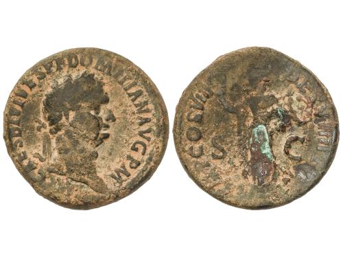 IMPERIO ROMANO. Sestercio. 82 d.C. DOMICIANO. Anv.: IMP. CAES. DIVI. VESP. F. DOMITIAN. AVG. P. M. Cabeza laureada a derecha. Rev.: TR. P. COS. VIII DES. VIIII. P. P. S. C. Palas en pie a izquierda con lanza. 21,52 grs. (Oxidaciones). Pátina marrón. C-581; RIC-240a. MBC-.