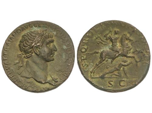 IMPERIO ROMANO. Sestercio. 104-110 d.C. TRAJANO. Anv.: IMP. CAES. NERVAE TRAIANO AVG. GER. DAC. P. M. TR. P. COS. V P. P. Busto laureado a derecha. Rev.: S. P. Q. R. OPTIMO PRINCIPI S. C. Trajano a galope a derecha con lanza y derribando a un enemigo. 21,91 grs. (Oxidaciones, algo limpiada). Pátina verde. C-503. (MBC).