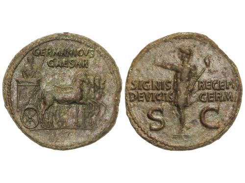 IMPERIO ROMANO. Dupondio. 37-41 d.C. GERMÁNICO. Anv.: GERMANICVS CAESAR. Germánico, en cuadriga a derecha. Rev.: SIGNIS RECEPT. DEVICTIS. GERM. S. C. Germánico en pie a izquierda, portando cetro. 13,28 grs. (Algo realzada, oxidaciones). Pátina. RARA. C-7. MBC.