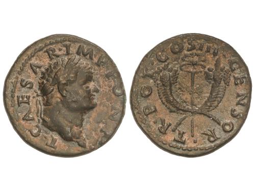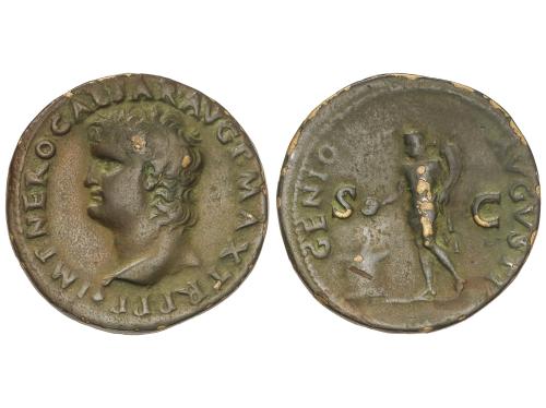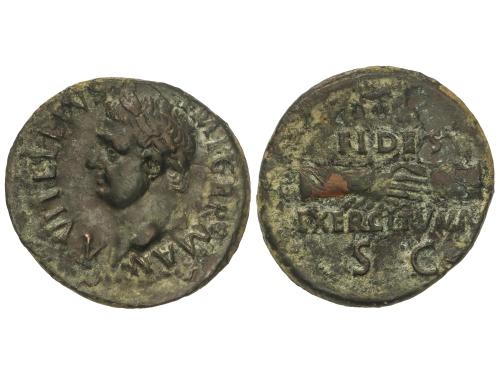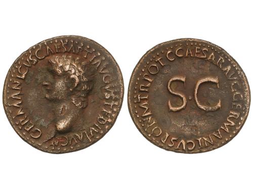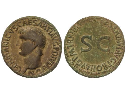 IMPERIO ROMANO. As. 37-38 d.C. GERMANICO. Anv.: GERMANICVS CAESAR TI. AVGVST. F. DIVI. AVG. N. Cabeza descubierta a izquierda. Rev.: C. CAESAR AVG. GERMANICVS PON. M. TR. POT., alrededor S. C. 10,26 grs. (Oxidaciones). Pátina. C-1; RIC-44. MBC/MBC+.