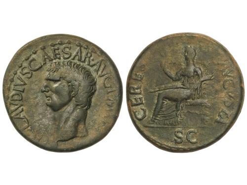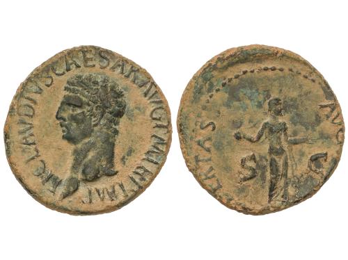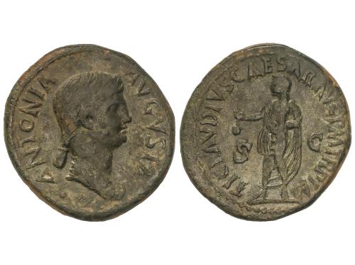 IMPERIO ROMANO. Dupondio. 41-42 d.C. ANTONIA. Anv.: ANTONIA AVGVSTA. Busto descubierto a derecha. Rev.: TI. CLAVDIVS CAESAR AVG. P. M. TR. P. IMP. S.C. Claudio velado en pie a izquierda, con símpulo. 11,89 grs. Pátina verde. BMC-166; C-6; RIC-92 (de Claudio). MBC.