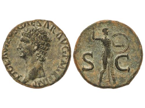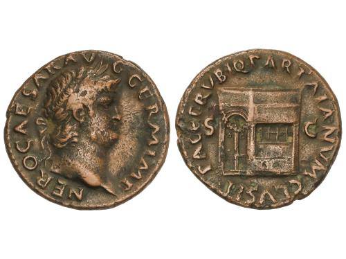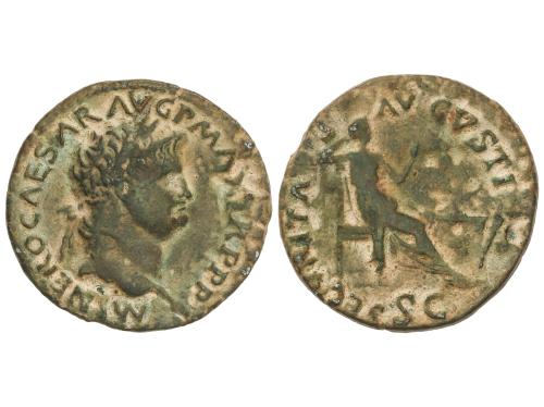 IMPERIO ROMANO. As. 54-55 d.C. NERON. Anv.: IMP. NERO CAESAR AVG. P. MAX. TR. P. P. P. Cabeza descubierta a izquierda. Rev.: GENIO AVGVSTI S. C. Genio en pie a izquierda con pátera y cornucopia, altar a sus pies. 11,05 grs. Pátina verde. C-104. MBC.