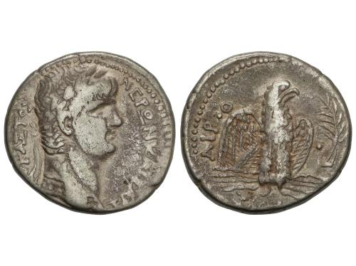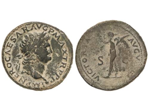 IMPERIO ROMANO. Sestercio. 62-68 d.C. NERÓN. Lugdunum. Anv.: IMP. NERO CAESAR AVG.P MAX. TR. POT.P P. Cabeza laureada a derecha. Rev.: ANNONA AVGVSTI CERES. Ceres sentada a izquierda con antorcha y espigas, frente a ella Annona con cornucopia. En exergo S C. 22,11 grs. (Oxidaciones). ESCASA. RIC-571. MBC/MBC-.