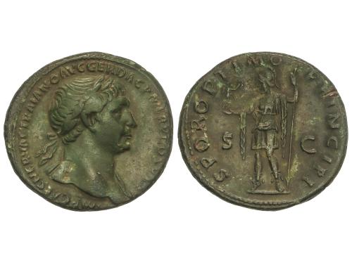 IMPERIO ROMANO. Sestercio. 104-110 d.C. TRAJANO. Anv.: IMP. CAES. NERVAE TRAIANO AVG. GER. DAC. P. M. TR. P. COS. V P. P. Busto laureado a derecha. Rev.: S. P. Q. R. OPTIMO PRINCIPI S. C. Trajano a galope a derecha con lanza y derribando a un enemigo. 21,91 grs. (Oxidaciones, algo limpiada). Pátina verde. C-503. (MBC).