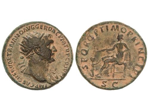 IMPERIO ROMANO. Sestercio. 104-110 d.C. TRAJANO. Anv.: IMP. CAES. NERVAE TRAIANO AVG. GER. DAC. P. M. TR. P. COS. V P. P. Busto laureado a derecha. Rev.: S. P. Q. R. OPTIMO PRINCIPI S. C. Trajano a galope a derecha con lanza y derribando a un enemigo. 21,91 grs. (Oxidaciones, algo limpiada). Pátina verde. C-503. (MBC).